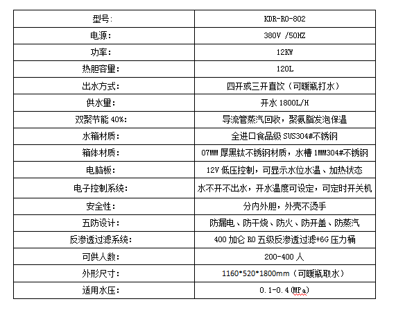 科蒂洛KDR-RO-802-B步進式開水器,采用國際領先逆滲透技術,運用五級凈化工藝,可以輕松濾除水中的離子、細菌、鐵銹、泥沙、余氯、膠體、有機物、重金屬等物質。凈化之后的水質優于國家標準《瓶裝飲用純凈水》(GB-17323-1998)。