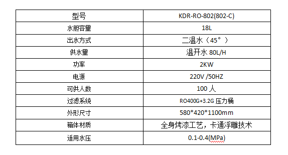 科蒂洛KDR-RO-802-C校園直飲機,采用國際領先逆滲透技術,運用五級凈化工藝,可以輕松濾除水中的離子、細菌、鐵銹、泥沙、余氯、膠體、有機物、重金屬等物質。凈化之后的水質優于國家標準《瓶裝飲用純凈水》(GB-17323-1998)。